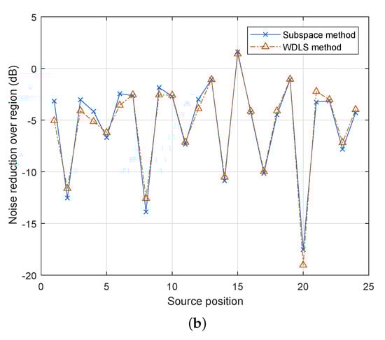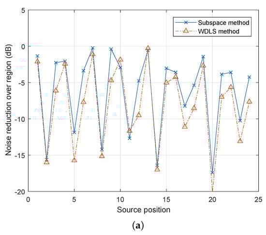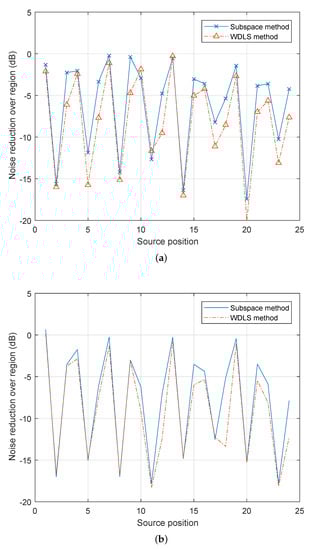 Figure 6 demonstrates the noise reduction performance for different source positions. For most of the positions, the WDLS method can achieve slightly better noise reduction than the subspace method. This is because the subspace method only uses the principal components while the WDLS method exploits all the information of the secondary path. Since 8 out of 12 loudspeakers are located in the x-y plane, the noise source positions indicated better noise reduction levels in Figure 6a,b are position No. 2, 5, 8, 11, 14, 17, 20, 23, which are the source candidates on the x-y plane. As the accuracy of the microphone recordings is reduced, the performance prediction becomes less accurate. For example, as shown in Figure 6b, at the noise source position 15, using both methods, the noise reduction levels are positive, which indicates the opposite result from that of Figure 6a.