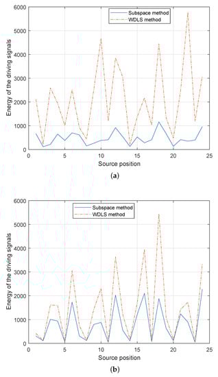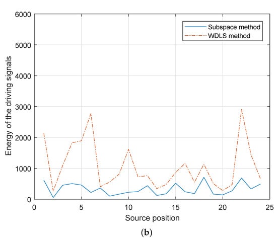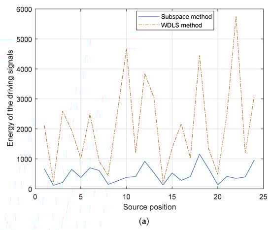 Figure 7 demonstrates the energy of the loudspeaker driving signals ( in (35)) using different methods (Here, we evaluate the summation of squared driving signals, for all the loudspeakers.). As shown in Figure 7a,b, in both cases, compared with the WDLS method, the proposed subspace method can reduce the total energy on the loudspeakers significantly, which can avoid the overloading of the secondary sources.