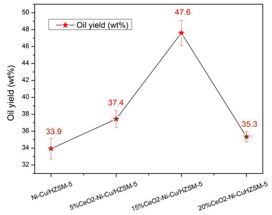Figure 1 shows the yield (Y) change of upgrading oil at 270 °C for 1 h with different catalysts. Y is higher with the addition of CeO2 than that without CeO2, and Y increases first and then decreases with increasing CeO2 added content. With 15% CeO2–Ni–Cu/HZSM-5, Y can reach the highest value, accounting for 47.6 wt%.