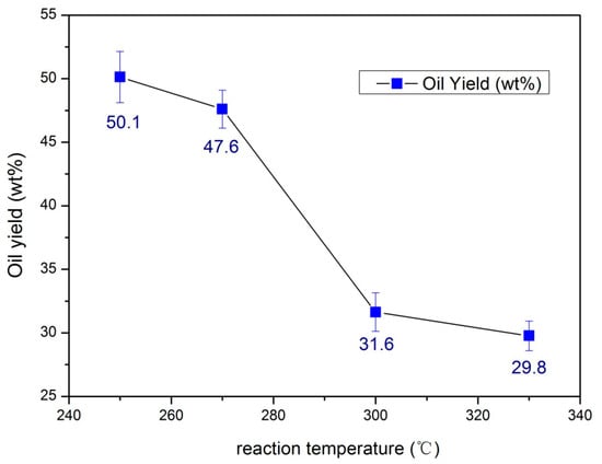To further explore the effect of reaction temperature of the Ni-based catalysts with 15% CeO2 for the HDO of bio-oil, we used 15%CeO2–Ni–Cu/HZSM-5 at different temperatures. As shown in Figure 2, Y starts to decrease with the increase of reaction temperature, and Y declines rapidly when the temperature is between 270 and 300 °C.