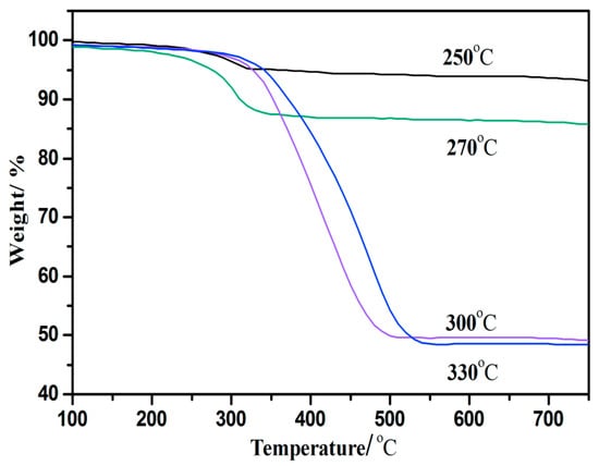The effect of HDO increased with the rise of reaction temperature, and the water and oxygen contents decreased with the increase of temperature (Table 2), indicating that the HDO effect of bio-oil gradually increased with temperature. However, the amount of coke deposited on the catalyst after the reaction increased rapidly at the reaction temperature from 270 to 300 °C. The coke content on the surface of the catalyst in the bio-oil HDO process was measured by TG analysis. The weight losses of the 15% CeO2–Ni–Cu/HZSM-5 catalyst at 250, 270, 300, and 330 °C for 1 h were 7, 15, 48, and 54%, respectively (Figure 3). The carbon depositions on the 15% CeO2–Ni–Cu/HZSM-5 catalyst were 7%, 15%, 48%, and 54% (wt%) after reactions at 250 °C, 270 °C, 300 °C, and 330 °C for 1 h, respectively. Temperature is one of the main factors affecting coke deposition, and it causes the deactivation of the catalyst. Y decreased rapidly between 270 °C and 300 °C. From the energy utilization perspective, 270 °C is the suitable temperature for HDO when the CeO2 content is 15% of the Ni–Cu/HZSM-5 catalyst.