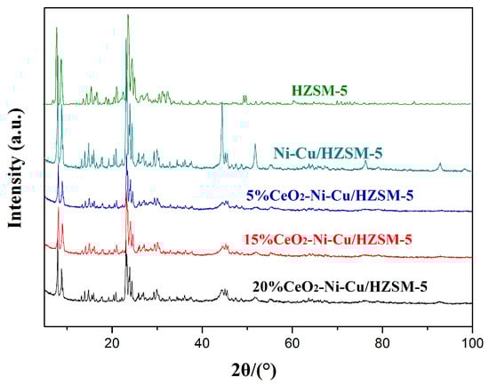 The XRD patterns of HZSM-5 and Ni–Cu/HZSM-5 with different CeO2 contents.