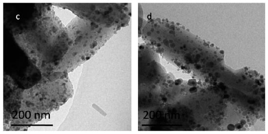 TEM images of different catalysts: (a) Ni–Cu/HZSM-5, (b) 5%CeO2–Ni–Cu/HZSM-5, (c) 15%CeO2–Ni–Cu/HZSM-5, and (d) 20%CeO2–Ni–Cu/HZSM-5.