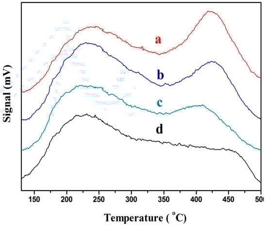 The acidity of the surface of the catalyst can be effectively measured by NH3-TPD. Figure 6 presents the NH3-TPD curves of the catalysts with different CeO2 contents, in which Figure 6a–d correspond to CeO2 contents of 15, 5, 20, and 0%, respectively. The four catalysts with different CeO2 contents have the same peaks at 225 and 430 °C that correspond to the Bronsted and Lewis acid positions [], respectively. The extent of these two peaks before the reaction is shown in Table 6.