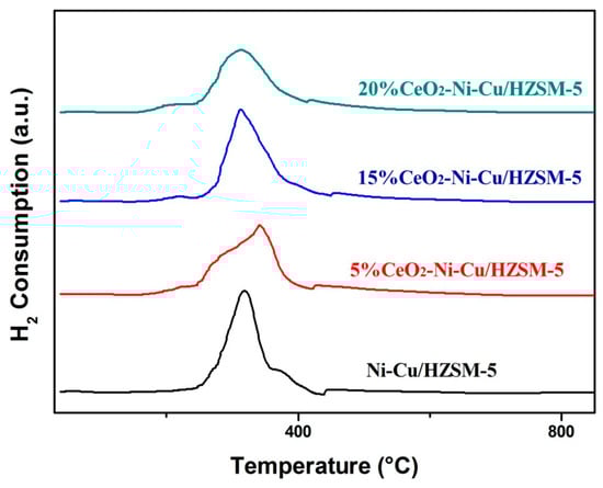 H2-TPR can effectively determine the reducing capacity of the catalyst. Figure 7 shows the H2-TPR profiles of the catalyst before the HDO reaction. All the samples have no peak at the high temperature (>600 °C); this temperature corresponds to the reduction peak of nickel spinel [], indicating no nickel spinel was produced in the experimental catalysts. Figure 4 of the XRD plots indicates the absence of the spinel phase for Ni. For example, NiO is shown in 2θ of 37.8, 44.7, and 62.3 (PDF# 78–0429) and NiAl2O4 in 2θ of 37.8, 42.3, and 68.4 (PDF# 78–0552) as reported by Shih and Leckie []—these 2θ data are not shown in the Figure 4 XRD spectra, albeit 44.7° indicates a slight peak. The slight difference in TPR profiles (with respect to peak pattern and corresponding temperatures) can be ascribed to the variation in Ni dispersion and active metal–HZSM-5 interaction. Compared with the reduction peaks of the catalyst with a 20% CeO2 content, the catalyst with a 15% CeO2 content exhibited a sharper reduction peak, indicating the presence of more uniform and highly dispersed metal particles []. Therefore, different CeO2 contents have slight effects on the reduction temperature of the catalyst. In particular, the reduction temperature reached the lowest at the catalyst with a 15% CeO2 content. Usually, the rapid deactivation of the catalyst is caused by the carbon deposition at a high HDO temperature. A low reduction indicates a low-temperature HDO process, hence, the less degree of carbon deposition on the catalysts during HDO. The catalyst with 15% CeO2 can promote the hydrogenation process at low temperatures, and the degree of carbon deposition on the catalysts can be effectively slacked during HDO.