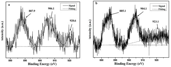 The binding energies near the peaks shown in Figure 8 and Figure 9 were directly retrieved from the instrument. The XPS analyses for the catalyst before and after HDO exhibited peaks in the vicinity of 884.5 and 905.4 eV (Figure 8a), which corresponded to the electron bonding energy of Ce3d5/2 and Ce3d3/2, respectively []. The electronic binding energy of 920.6 eV (Figure 8a) belongs to the position peak of Ce4+ []. Figure 8b shows that the binding energy of Ce in the catalyst after the reaction exhibits approximately more than 2.5 eV of chemical shift of the Ce3d peaks, indicating a change in the valence state of Ce in the strong reduction atmosphere. According to the standard XPS spectra of Ce, the peak of Ce3d5/2 (887.9 eV) in the catalyst before the reaction is attributable to CeO2, whereas the peak of Ce3d5/2 after the reaction (885.1 eV) is attributable to the low-valence Ce, indicating that the Ce4+ content of the catalyst is reduced to Ce3+ during the reaction. In addition, part of the Ce4+ in CeO2 is reduced to Ce3+, oxygen vacancies are produced, and free electrons and lattice oxygen are released. The released electrons can be transferred to the active site of Ni0, thereby adjusting the electronic state of Ni atom on the surface, improving the interaction between the carrier and the active component resulting in better dispersion of Ni [,], and thus improving the catalyst’s redox ability. The release of lattice oxygen is also beneficial in transferring active carbon species on the catalyst surface, thus promoting coke removal [,].
