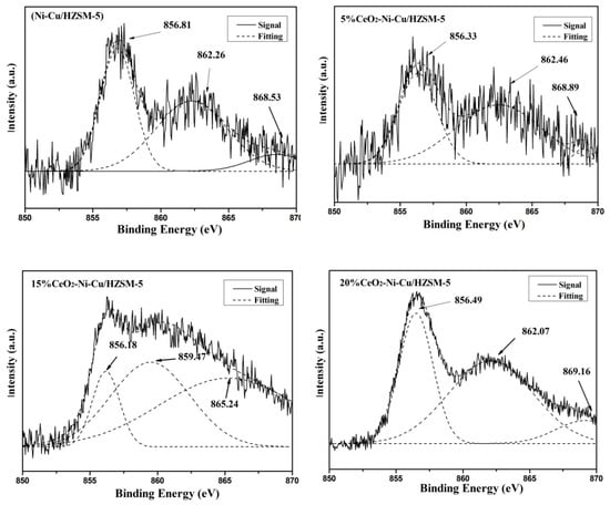 Figure 9 shows the Ni 2p XPS spectra of the used catalyst after the reaction at 270 °C for 1 h. The electron binding energies of Ni 2p in the Ni-based catalyst were approximately 856.5, 862, and 870 eV, corresponding to the Ni–O bond, the shakeup peaks, and the Ni0 of the reduced state, respectively []. As seen from Figure 9, the peaks (865–869 eV) near 870 eV (Ni0 of the reduced state) is the lowest in the catalyst without adding CeO2, and correspondingly, the 856 eV peak (Ni–O) was relatively the highest. Thus, a small part of Ni0 was translated into the Ni–O bond with the CeO2 added catalysts resulting in a small amount of nickel oxidized, eventually leading to enhanced hydrogenolysis. In other words, the virgin catalyst limits the HDO reaction, and the catalyst becomes more conducive to carbon deposition []. The Ni0 content in the catalyst with CeO2 addition is higher than that without CeO2, and a slightly negative shift in the electron bonding energy is observed, which proves that the addition of CeO2 can increase the electron density of Ni0, increase the electronegativity of Ni, and improve the reduction ability of Ni []. Moreover, the Ni0 content and the electron binding energy of the catalysts with different CeO2 contents were also significantly different. In short, at a 15% CeO2 content, the Ni0 content was the largest, implying that the carbon deposition was the lowest and the carbon resistance was the strongest.