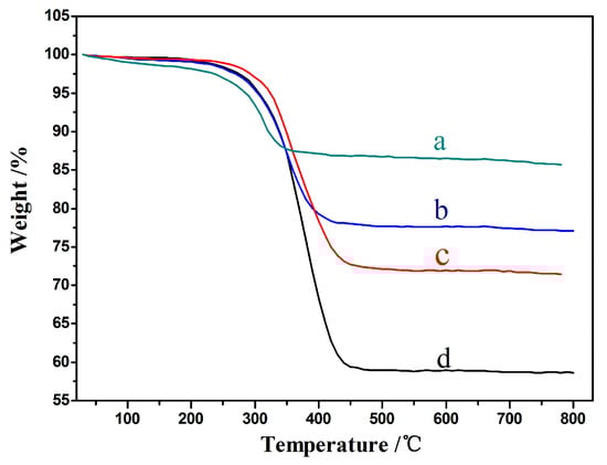 A TG analysis is an effective method for obtaining carbon activities and regeneration levels. Figure 10 shows the weight loss of different catalysts after a reaction under the same condition, in which a–d correspond to the 15%CeO2–Ni–Cu/HZSM-5, 5%CeO2–Ni–Cu/HZSM-5, 20%CeO2–Ni–Cu/HZSM-5, and Ni–Cu/HZSM-5 catalysts, respectively. The weight losses were 14, 23, 29, and 41% at 270 °C after a reaction time of 1 h, indicating that the amount of coke deposition is significantly lower with CeO2 addition than that without CeO2 addition. It means that the catalysts added with CeO2 can exhibit a better carbon deposition resistance. Again, with a 15% CeO2 addition, the weight loss is the least (14%) or the coke deposition is the least, agreeing with the previous assessments that the 15% CeO2 is the optimal amount for the HDO reaction of bio-oil. This finding suggests that a catalyst with a proper amount of CeO2 can improve the carbon resistance of the catalyst, but if excessive CeO2 is added, the carbon resistance of the catalyst is reduced. An excessive amount of CeO2 may cover the active site of a part of the Ni, thus reducing the chance of contact between the reactants and the active site, resulting in a large amount of carbon accumulation.