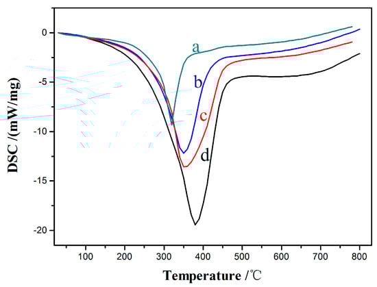Figure 11 of the DSC profiles (heat loss mW/mg) illustrates the type and distribution of the carbon deposits from the heat release curves of different catalysts under the same reaction conditions. Coke decomposition can be divided into four stages, namely, 100–250, 250–450 450–600, and 600–750 °C, which correspond to the decomposition temperatures of the small-molecule component results, soft coke, hard coke, graphite and graphite-like carbon, respectively [,]. The catalyst without CeO2 addition appears with an exothermic peak at 380 °C. The exothermic peaks of the added CeO2 catalysts apparently shifted to the left, or with 5%, 15%, and 20% CeO2, the peaks were 340, 310, and 360 °C, respectively, which prove that the main deposit on the catalyst is a soft carbon (soluble in organic solvent). The peak temperature reached the lowest (310 °C) when the CeO2 load was 15% because the soluble carbon deposited at this time has a relatively small molecular weight derivative (i.e., low boiling point and high solubility). The results indicate that the addition of CeO2 may lead to a substantial improvement in the resistance of the Ni–Cu/HZSM-5 catalyst against carbon deposition, and the different CeO2 contents have different effects on the catalyst’s resistance to carbon accumulation. In other words, when the CeO2 load is 15%, the ability of the catalyst to resist carbon may be the strongest.