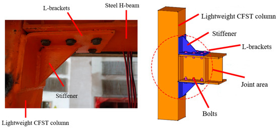 The framework comprised lightweight recycled CFST columns and steel H-beams joined with a structure of double stiffener-reinforced L-brackets. The specification of the square steel tube for the columns was 150 × 150 × 6 mm. The specification of the steel H-beam was HM 194 × 150 × 6 × 9 mm. To join the column and beam, two stiffener-reinforced L-brackets were welded to the column and connected to the beam with M12 high-strength bolts (grade 8.8), as shown in Figure 1.