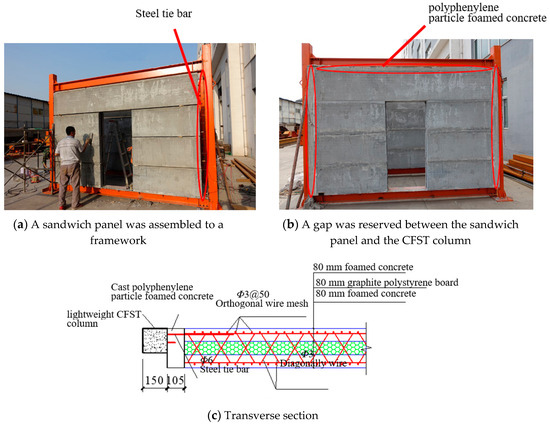 The connection between a framework and a sandwich panel was realized by the steel-tie bars attached to the panel. The exposed part of the steel-tie bar was extended horizontally from within the panel and was then bent at an angle of 90°. The length of the horizontal section was 105 mm and the length of the bent section was 40 mm. A sandwich panel was assembled to a framework by continuously welding the bent section of the exposed steel tie bar to the framework columns, as shown in Figure 5a. A gap was reserved between the sandwich panel and the CFST column and filled with back-cast polyphenylene particle foamed concrete, as shown in Figure 5b,c with details of the panel–column connection.