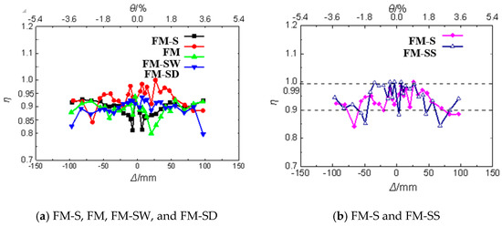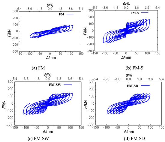 Regarding specimens FM-S, FM-SW, and FM-SD, the slopes of the hysteresis curves increased with an increase in displacement and load, which exhibits a turning point right before the displacement reached the target value. It then decreased with an increase in displacement. The curves under the same direction of loading show that the slope under a later loading increment was clearly smaller than that under an earlier increment. Additionally, after repeated loading increments, the hysteresis curves of the specimens gradually became more full-rounded, which changes from a reverse-‘S’ shape to a ‘Z’ shape.