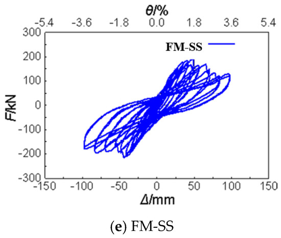 The hysteresis curves of specimen FM-SS was the reverse-‘S’ shape, which has a smaller enveloped area and indicates smaller energy-dissipation capacity of the structure. However, the specimen exhibited a higher load-bearing capacity at displacement angles smaller than 1.8%. A comparison of the curves under the same direction of loading revealed greater slopes and smaller reductions of the hysteresis curves prior to the point of the ultimate displacement angle (i.e., the displacement angle corresponding to the ultimate load), and a drastic decrease of the slopes of the hysteresis curves beyond the point of the ultimate displacement angle.