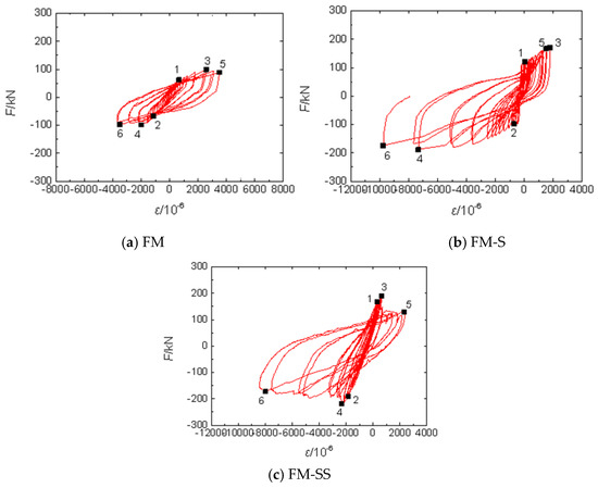 Higher strains developed at the lower part of the framework columns and the ends of the specimen beam. Thus, an analysis of the cross-sectional strains in the lower part of the columns and at the ends of beams was performed on the typical specimens, FM, FM-S, and FM-SS. Figure 22 showed the cross-sectional lateral load-strain curves of the lower part of the columns of the typical specimens. The strains shown in the figure were measured at the middle of the steel-tube wall. Points 1 and 2 in the figure correspond to the yield loads, points 3 and 4 correspond to the ultimate loads, and points 5 and 6 correspond to the failure loads of the specimens.