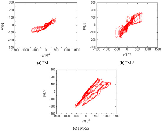 Figure 16 showed that the hysteresis curve of specimen FM was clearly different from the hysteresis curves of the specimens with sandwich panels. The hysteresis curve of specimen FM did not exhibit a turning point as the load increased, which indicates smaller load-bearing and a smaller-energy dissipation capacity. The curve was shuttle-shaped and did not exhibit a clear centralization trend.