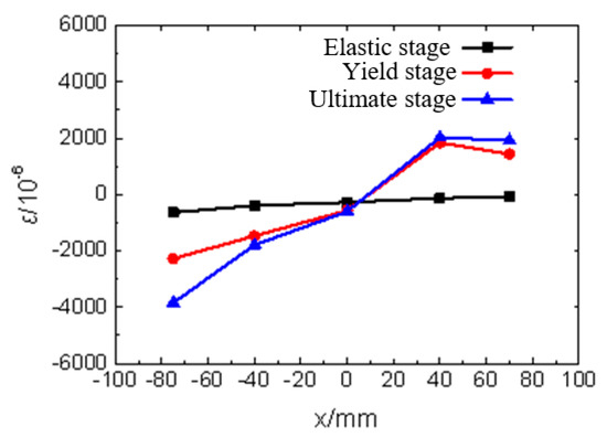 Figure 25 showed the distribution of the cross-sectional strain in the lower part of the columns. Under loads smaller than the yield load, the cross-sectional strain in the lower part of the framework columns of specimen FG were consistent with the plane cross-section assumption. Under loads higher than the yield load, the strain along the outer sides of the cross-section in the lower part of the framework column clearly increased, and the distribution of the cross-sectional strain was no longer consistent with the plane cross-section assumption.
