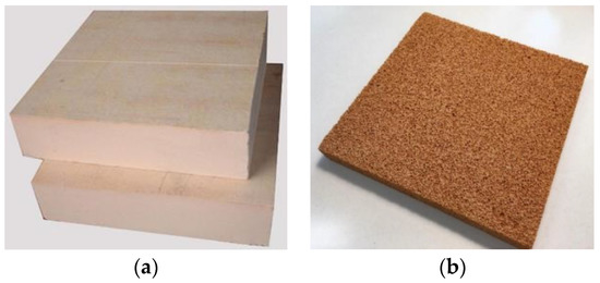 Common types of core are honeycomb structures, made of aluminum, paper, or plastic. Foam cores are another frequent choice due to their low weight and good insulation properties, and they can be realized in several different materials, including metal and polymer-based compounds. Polyurethane (PUR), polyethylene (PE), and polystyrene (PS) are widely used as core materials, but they have limited high-temperature resistance [21] and, when exposed to fire, they deteriorate, ignite, and release toxic gases. A valid alternative in this respect is represented by phenolic resins, which show excellent fire properties [22] including low, non-toxic fume generation. Phenolic foam (PF) is a thermosetting cellular material that is widely used in the construction industry. The environmental life-cycle impact of phenolic foam items is to be considered, especially because of its potential scale of application [23]. As all conventional foams, phenolic foams are obtained by mixing a liquid resin, a blowing agent and an acid catalyst, with further additives that can be added to the mixture to provide the material with certain desired characteristics. Very common blowing agents used to be volatile organic compounds (VOCs) or chlorofluorocarbons (CFCs) like trichlorofluoromethane, also known as CFC-11. In the late 1980s, following the Montreal Protocol, CFCs and HCFCs were phased out because proven ozone-depleting substances, thus they were partially replaced by hydrofluorocarbons (HFCs) like HFC 365mfc/227ea blends. Recently, HFCs have also been phased down after the Kigali Amendment to the Montreal Protocol and the European F-gas regulation, due to their relatively high global warming potential (GWP) [24]. PFs can be manufactured in either closed-cell or open-cell structures. In closed-cell PFs, the cells that form the structure of the material are sealed from each other and contain the blowing agent on a long-term basis (Figure 1a), thus, they are widely used for insulation purposes, especially in external wall, pipework and equipment insulation systems, for their good thermal properties and moisture resistance. On the other hand, in open-cell PFs (Figure 1b) the cells are interconnected to each other and the blowing agent escapes during the manufacturing process, leaving air instead. The latter structure can be chosen over the former one for its lower density, higher transpiration capability and lower thermal expansion.