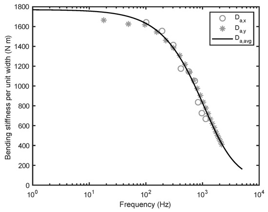 The natural frequencies of the beams cut in the x-direction and in the y-direction have been identified as the peaks in the frequency response functions between the accelerometer and the impact hammer. The corresponding apparent bending stiffness values have been calculated through Equations (9)–(11) have been used to reconstruct the average bending stiffness per unit width curve represented in Figure 6.
