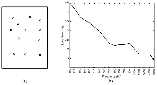 Determination of the loss factor. (a) Measurement positions over the panel tested in reverberation rooms. (b) Resulting loss factor as a function of frequency.