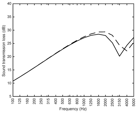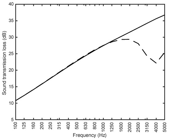 The dashed line in Figure 8 represents the sound transmission loss calculated from the non-resonant transmission coefficient τNR. The agreement with the results from the measurement carried out in reverberant rooms is fair.