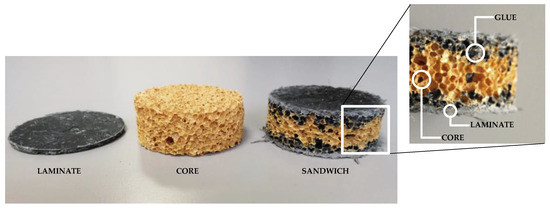 Sandwich materials samples. In the sandwich structure, the additional glue “layer” at the interface between each laminate and the core is visible.