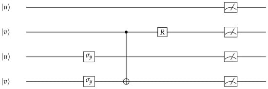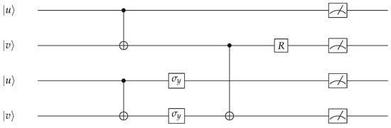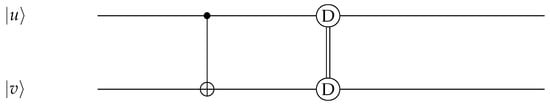 So, taking this into account, our proposal to implement the operator D using Romero et al. circuit [54], transforms the circuit model of the M z operator from Figure 2, Figure 3 and Figure 4. It is obvious that M z operator applies two main operations. In the first operation, the C N O T gate is applied on each replica of the two-qubit systems | u and | v as the control qubit and as a target qubit, respectively. Accordingly, there are two cases: