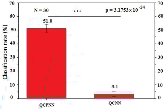 Figure 5. Comparison of the classification rates of the proposed model QCPNN and the QCNN model [21], for classifying the state of RCP in a risky NPP. Red bars indicate mean values averaged over N = 30 runs, error bars indicate the corresponding standard deviations. The difference is highly significant ( p = 3.1753 × 10 34 < 0.001 ). For both models the number of neurons was set to 13.