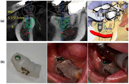 Computer aided surgery (a) 3D digital implant planning with software, (b) surgical template.
