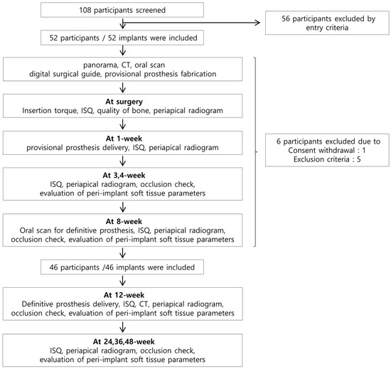 Fifty-six of a total of 108 screened candidates were excluded by the entry criteria. During the 2 months after surgery, six participants dropped out because they could not fulfill the protocol standards. On the day of surgery, one subject withdrew the consent to continue participating in the study and five additional subjects were excluded due to low bone density (D4) and low initial stability values (ISQ < 65, insertion torque < 35) (Figure 3). As a result, the data from 46 implants in 46 participants were used for the final statistical analysis of the present study.