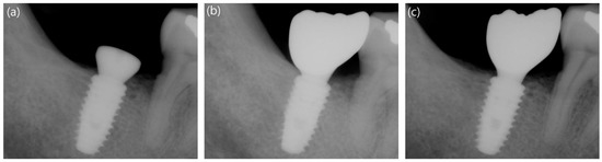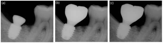 Standard periapical radiographs of implants placed in a patient in the control group (CMI IS-III active® long implant, Neobiotech Co., Seoul, Korea): (a) at surgery, (b) at 12 weeks, and (c) at 48 weeks.