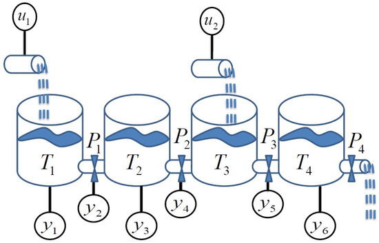 A four-tank system is used as a running example in the paper; see Figure 1. The system is assumed to be divided into four non-overlapping subsystems, where each subsystem is constituted of one tank and the outlet pipe to its right. Two of the subsystems, 1 and 3, also have external inflows into their tanks. Associated with each subsystem is a set of measurements, , that are shown as encircled variables in the figure.