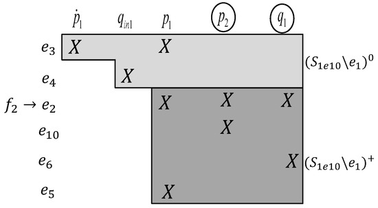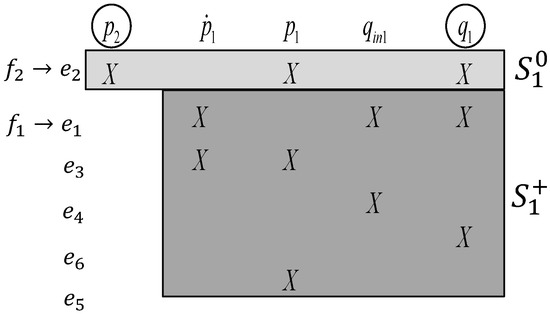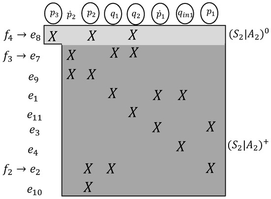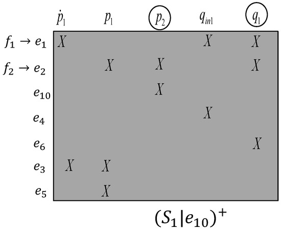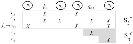 Figure 4 shows DM decomposition of the . Equation is in the over-determined part of the augmented subsystem model; therefore, is locally isolable from in the augmented subsystem.