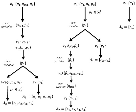 The MSO sets are minimal sets of equations that can be used to generate residuals, for example by using the Fault diagnosis toolbox developed by Frisk and Krysander [22]. MSO sets represent redundant equation sets that capture the redundancies in the system: . For example, , where , , , and represent an MSO set in subsystem (1) of our running example. For brevity and simplification, we simply say a specific equation, variable, measurement, or fault is a member of an MSO in the rest of the paper, e.g., . Each MSO set represents a part of the system model that can be used to design a residual that is only sensitive to certain faults. A set of MSO sets can be used to generate residuals that together can isolate a set of faults.