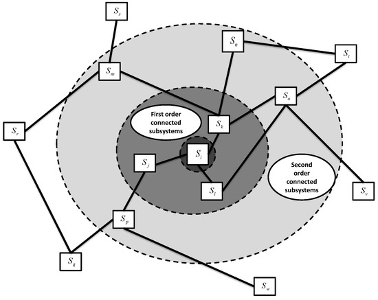In the four-tank example, subsystems and are first order connected, and their shared variables are . Similarly, and are second order connected because both of them are first order connected to .