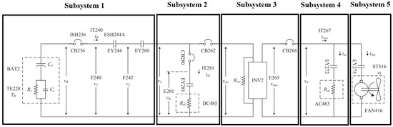 where is the set of unknown variables in this subsystem, the set of measurements is , represents subsystem faults, and , and are the component parameters in the subsystem. The battery is directly connected to the second subsystem (DC load).