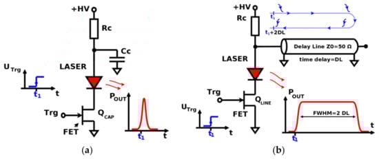 In the other topology, which is shown in Figure 1b, an open-end delay line was utilized as a charge storage element. When the trigger signal (denoted as Trg) is applied, the transistor QLINE starts to discharge the line. The delay line acts then as a constant current sink (the peak current is determined by the characteristic impedance Z0 of the transmission line and initial line voltage) by the time needed by the falling edge signal to propagate back and forth through the passive element. The duration of the optical pulse resulting from the square wave applied to the laser is approximately 2 ∙ DL, thus a pulse width adjustment is possible only by replacing the physical element (i.e., the delay line). On the other hand, the peak power is independent of the pulse timing and might be adjusted by the +HV voltage setting.
