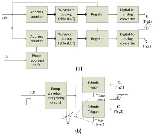 The circuit in Figure 2 requires synchronized clock sources responsible for the triggering of Q1 and Q2. There are common approaches that incorporate either an adjustable delay obtained with the use of either the Direct Digital Synthesis (DDS) circuit (Figure 3a) [10,11,12] or an analogue approach based on the ramp source and a programmable comparator (see Figure 3b) [10,11,12]. The analogue solution is relatively inexpensive; however, several drawbacks of an analogue delay line may decrease the functionality of the laser driver. The first drawback results from the temperature influence on the parameters of component parameters (i.e., capacitance, intrinsic propagation delays, and threshold voltages). Therefore, a thermal compensation of the circuit is necessary. The second drawback results from the noise processes affecting the relative position of the delayed clock slopes. On the contrary, the digital solutions based on the DDS ensuring sub-nanosecond resolutions are expensive or require high clock speeds.
