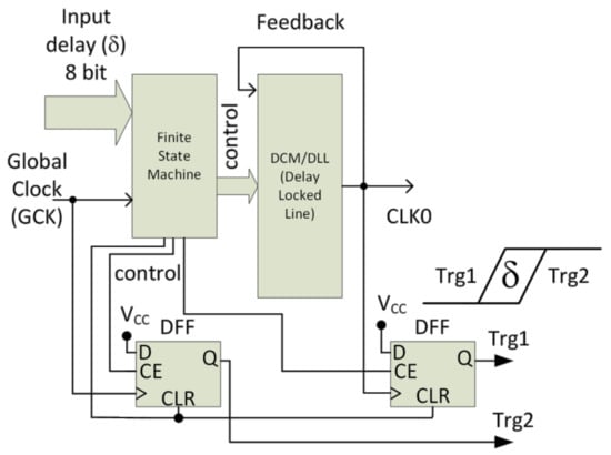 The block diagram of the digital timing circuit is shown in Figure 5, and also contains a Finite State Machine, which is responsible for proper DCM and D flip-flop timing. The Finite State Machine adjusts the delay setting of the DCM according to the 8-bit input value, and ensures the limited repetition rate (output frequency of Trg1 and Trg2, despite the GCK frequency. The output signals Trg1 and Trg2 are directly connected to the input buffers (74AC series) shown in Figure 2.