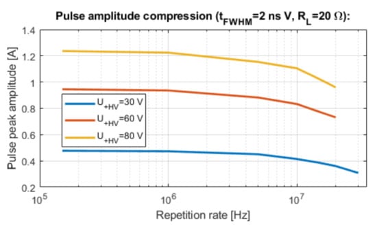 Operating with higher repetition rates leads to the peak power amplitude compression. In Figure 8, a less than 2.5 dB drop of the initial current amplitude is observed for frep max = 20 MHz. The obtained frepmax frequency at 1.25 A pulse current is high, when compared to professional solutions available on the market [14].