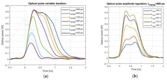 The effect of the pulse width regulation obtained with the designed driver is shown in Figure 9a. The shortest measured pulse has a symmetrical Gaussian shape and duration of 322 ps, which confirms the high-speed and high-current switching performance of the solution. The maximum pulse width is limited to 940 ps, because of the particular laser`s turn-on delay time. However, all measured optical pulses are characterized with rise time <220 ps and fall time <680 ps, which is much shorter than the laser manufacturer’s specification (see Table 2).