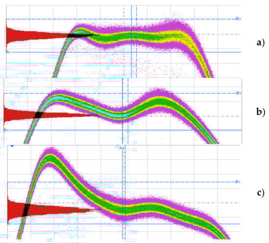 The measurements shown in Figure 9 prove that the developed laser driver is capable of independent regulation of the pulse width and amplitude, although one of the key parameters of the developed laser driver is a very low timing noise. In Figure 10a, family of time domain waveforms corresponding to multiple optical pulses generated by the laser diode are shown. The “blur” observed at the falling edges represents the phase fluctuations of the signal (noise in the time domain)—jitter. The maximum measured jitter is σt = 28 ps for tFWHM = 500 ps. This ensures stable and reproducible optical pulse generation, regardless of the width of the optical pulse.