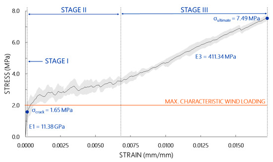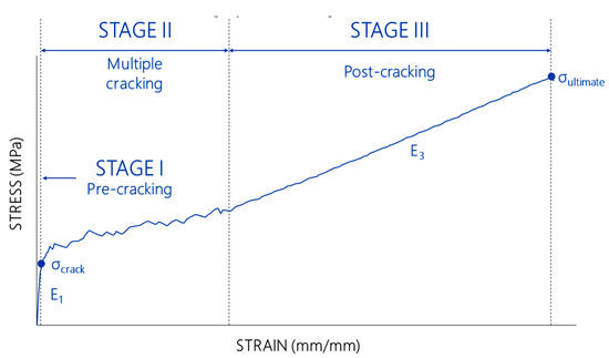 Textile reinforced cementitious composite (TRC) is characterized by a linear behavior in compression and a non-linear behavior in tension. This non-linear tensile behavior was observed in various experiments [16,17,18,19,20]. Parallel to this experimental campaign, different models were elaborated to predict the structural behavior of TRC [21,22,23,24]. Generally, the tensile behavior of the composite can be divided into three different stages (Figure 1). During the first linear stage, fibers and matrix are working together, and the modulus is given by the law of mixtures. For composites with a low fiber volume fraction, the modulus of the matrix is determining for the resulting initial modulus E1. Cracks start forming in the matrix when the ultimate tensile stress of the matrix is exceeded, resulting in a reduction of the modulus. Once a crack is formed, the load is redistributed. This process of the formation of cracks and subsequently redistribution of the load is called the multiple cracking stage and repeats itself until the matrix is fully saturated with cracks. The third and last stage is called the post-cracking stage. In this linear stage, the additional load is only carried by the fibers. The tangential modulus of the composite E3 is determined by the modulus of the fibers and the fiber volume fraction. Finally, failure of the composite material is induced by tensile rupture of the textile at a strain largely exceeding the tensile failure strain of the matrix.