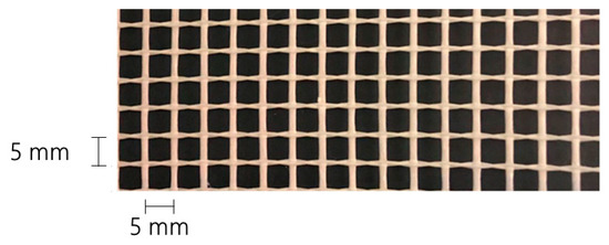 A technical textile made of AR glass rovings is embedded in the mortar. The textile is polymer coated and woven into an orthogonal mesh. The textile has a nominal tensile strength of 2500 N per 50 mm, a total surface weight of 200 g/m2 (165 g/m2 glass fibers), and a mesh opening of 5 mm in both directions [30] (Figure 2).