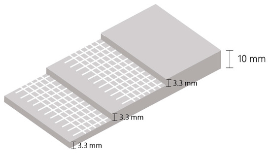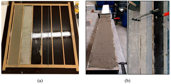 The experiments on the material level were carried out on prismatic TRC coupons, with a nominal length of 500 mm, a nominal width of 75 mm, and a nominal thickness of 10 mm. All specimens had an identical build-up, reinforced with two layers of textile equally distributed over the height (Figure 3). To do so, they were made separately using a hand lay-up technique; the mortar was cast three times. After spreading out the first layer of mortar, a reinforcement fiber net was placed and impregnated in the mortar (Figure 4). Subsequently, a second layer of mortar and second reinforcement grid were placed. Once the third layer of mortar was cast, a plastic sheet was used to seal the mold and to prevent premature evaporation of the water. All the coupons were demoulded after 24 h and had the same curing process for 28 days; stored at ambient temperature (approximately 20 °C) and a relative humidity of between 45% and 60% for at least 28 days. The resulting fiber volume fraction of the samples was equal to 1.29% (0.65% in the loading direction).