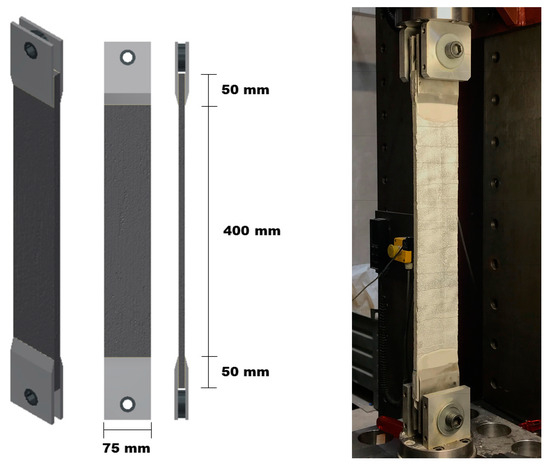 For the material level, uniaxial tensile tests on TRC coupons were preferred over bending tests, since they are more representative for the considered application: the thin faces of a sandwich panel subjected to bending are loaded under (nearly) uniform tension or compression. In the uniaxial test set-up, the load was introduced via bolt through aluminum end-plates, which were glued to the TRC coupons with a two-component glue. Stress concentrations were avoided by tapering the end-plates (Figure 5). The specimens were loaded by a servo-hydraulic actuator with a capacity of 25 kN, using a 10 kN load cell. The static tests were displacement-controlled with a rate of 1 mm/min. The cyclic loading was load controlled at a frequency of 10 Hz. Displacements were measured with a dynamic extensometer at one side and digital image correlation (DIC) at the other side.