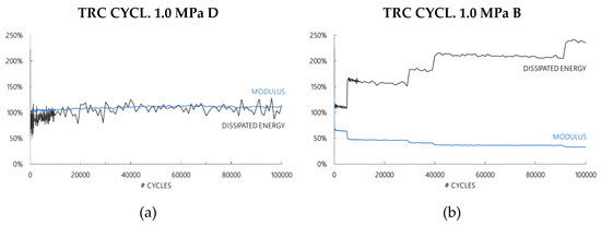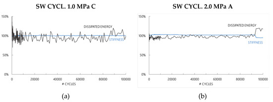 All specimens were loaded 100,000 cycles up to the specific stress level and unloaded to a stress level above 0 MPa to avoid loading the specimens in compression. To compare the different series, focus was put on the evolution of some distinctive fatigue parameters during the cyclic loading: the cycle modulus and the dissipative energy. The modulus per cycle was determined from the hysteresis curve by linear regression and expressed relatively compared to the modulus of the first cycle. The dissipative energy was calculated as the area enclosed by the loading–unloading curve of each cycle. As for the modulus, this was expressed relatively compared to the energy dissipation of the first cycle. The evolution of these different fatigue parameters was observed to be strongly related to the formation of cracks. Without the occurrence of cracks, both the modulus and the dissipative energy remained more or less constant (Figure 8a). Regardless of the applied maximum cycle stress (1.0 MPa or 2.0 MPa), each formation of a crack led to a decrease of the modulus, together with an increase in the dissipative energy (Figure 8b).