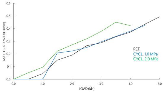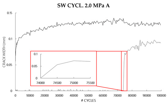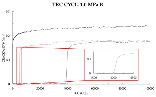 Once a crack was formed, its width tended to stabilize. Both for TRC CYCL. 1.0 MPa as for TRC CYCL. 2.0 MPa, the crack width increased during the first hundred cycles but stabilized afterwards. As an example, the evolution of the crack width was shown for a sample subjected to a maximum cycle stress of 1.0 MPa (Figure 9).