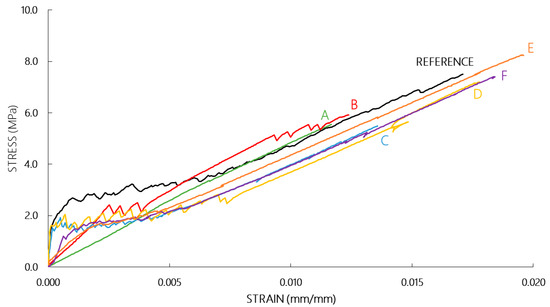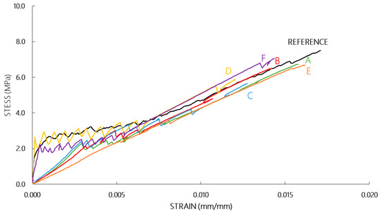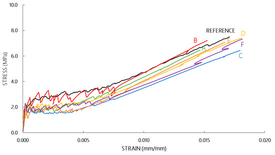 As the maximum stress to which the TRC coupons were cyclically loaded was increased for series TRC CYCL 1.0 MPa and TRC CYCL 2.0 MPa, so did the probability to the formation of cracks. Once a crack was formed, this directly resulted in a decrease of E1 measured in the residual stress–strain behavior. The more cracks are formed, the lower E1. Since this initial modulus was very dependent on the occurrence of cracks, a large scatter exists on the results and the average value of E1 was not representative and, therefore, not displayed in Table 7 and Table 8. A specimen fully saturated with cracks showed a linear behavior in the static tests, for example, specimen A in Figure 11 and specimen E in Figure 12. For these specimens, few extra cracks were formed during the static tests and the residual behavior was characterized with a modulus equal to E3 (Table 7 and Table 8). The cyclic preloading did not affect the modulus in the last branch, E3 (Table 7 and Table 8). Overall, the ultimate strength was lowered after subjection to loading cycles up to 1.0 MPa (Table 7) and 2.0 MPa (Table 8). However, no clear link was found between the number of cracks and the ultimate strength.