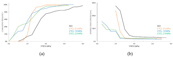 Looking at the cumulative frequency one could observe that more cracks were formed at lower stress levels for TRC CYCL 0.5 MPa, TRC CYCL 1.0 Mpa, and TRC CYCL 2.0 MPa., while for TRC REF 20% of the total amount of cracks were still formed at stress levels above 4.0 MPa (Figure 13a). The crack spacing showed a discrepancy between TRC REF and TRC CYCL 0.5 MPa versus TRC CYCL 1.0 MPa and TRC CYCL 2.0 MPa (Figure 13b) again. For TRC CYCL 1.0 MPa and TRC CYCL 2.0 MPa cracks originated at lower stress levels leading to a diminished crack spacing. As observed for the cumulative frequency, the crack patterns of the cyclically preloaded series were nearly complete at the stress level of 2.5 MPa. At all stress levels, the crack spacing of these series was lower compared to TRC REF, leading to the conclusion that more cracks were formed for TRC CYCL 0.5 MPa, TRC CYCL 1.0 Mpa, and TRC CYCL 2.0 MPa.