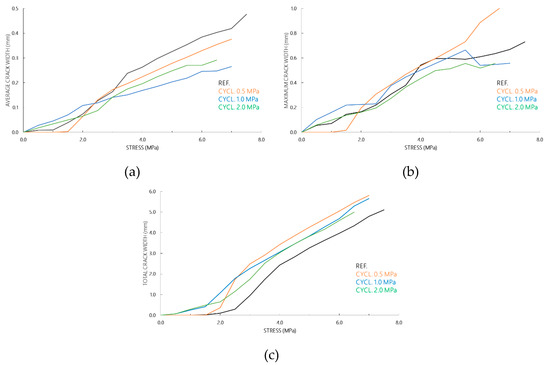Other than for TRC REF and TRC CYCL 0.5 MPa, TRC CYCL 1.0 Mpa, and TRC CYCL 2.0 MPa showed cracks already at stress levels lower than 1.0 MPa (Figure 14), as a consequence of the fact that cracks were already formed during the cyclic preloading. This is displayed for all studied parameters. Looking at the average crack width, a discrepancy was observed for stress levels below 2.0 MPa and above 2.0 MPa: at lower stress levels, TRC CYCL 1.0 MPa and TRC CYCL 2.0 MPa had a higher average crack width, while for higher stress levels, wider cracks were measured for TRC REF and TRC CYCL. 0.5 MPa (Figure 14a). The same tendency was seen for the maximum crack width but less pronounced (Figure 14b). Since this maximum crack width was strongly related to the durability requirements, one could state that the impact of repeated loading on durability measurements is little. The lowest total crack width was observed for TRC REF and this at all stress levels. (Figure 14c).